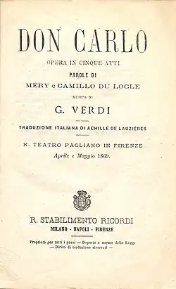 It was common practice at the time for most theatres (other than those in French-speaking communities) to perform operas in Italian,[12] and an Italian translation of Don Carlos was prepared in the autumn of 1866 by Achille de Lauzières.[13] On 18 November 1866 Verdi wrote to Giovanni Ricordi, offering the Milan publisher the Italian rights, but insisting that the opera: