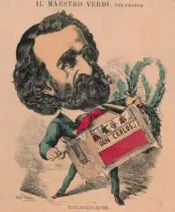 The Italian premiere on 27 October 1867 at the Teatro Comunale di Bologna, conducted by Verdi's close friend Angelo Mariani, was an "instant success", and this version, although produced in Verdi's absence, was more complete and included the ballet.[16] For the Rome premiere on 9 February 1868 at the Teatro Apollo, perhaps unsurprisingly, the Papal censor changed the Inquisitor into a Gran Cancelliere (Grand Chancellor) and the Monk/Emperor into a Solitario (Recluse).