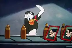 During World War II, Donald was the most prominent character in Disney's war efforts used for propaganda and morale, appearing in several animated propaganda films, including the 1943 Der Fuehrer's Face. In this cartoon, Donald plays a worker in an artillery factory in "Nutzi Land" (Nazi Germany). He struggles with long working hours, very small food rations,[24] and having to salute every time he sees a picture of the Führer (Adolf Hitler). These pictures appear in many places, such as on the assembly line in which he is screwing in the detonators of various sizes of shells. In the end, he becomes little more than a small part in a faceless machine with no choice but to obey until he falls, suffering a nervous breakdown. Then Donald wakes up to find that his experience was, in fact, a dream. At the end of the short, Donald looks to the Statue of Liberty and the American flag with renewed appreciation. Der Fuehrer's Face won the 1942 Academy Award for Animated Short Film. Der Fuehrer's Face was also the first of two animated short films to be set during the War to win an Oscar, the other being Tom and Jerry's short film, The Yankee Doodle Mouse.[25]