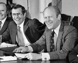 In August 1974, after Nixon resigned as president in the aftermath of the Watergate scandal, Rumsfeld was called back to Washington to serve as the transition chairman for the new president, Gerald Ford. He had been Ford's confidante since their days in the House, before Ford was House minority leader and was one of the members of the "Young Turks" who played a major role in bringing Ford to Republican leadership in the House of Representatives.[16] As the new president became settled in, Ford appointed Rumsfeld White House Chief of Staff, following Ford's appointment of General Alexander Haig to be the new Supreme Allied Commander Europe. Rumsfeld served from 1974 to 1975.[52][16]