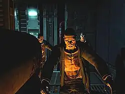 Frequent radio transmissions through the player's communications device also add to the atmosphere, by broadcasting certain sounds and messages from non-player characters meant to unsettle the player. Early in the game, during and directly after the event that plunges the base into chaos, the player often hears the sounds of fighting, screaming and dying through their radio transmitter. The ambient sound is extended to the base itself through such things as hissing pipes, footsteps, and occasional jarringly loud noises from machinery or other sources. Often ambient sounds can be heard that resemble deep breathing, unexplained voices and demonic taunting from the game's antagonists.[8]