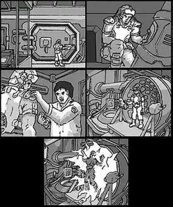 Echo One: Have you located Counsellor Swann? / Recon Zulu: Yes, sir. He's dead. / Echo One: Roger, Recon One. What about Doctor Betruger? / Recon Zulu: He's nowhere to be found sir.