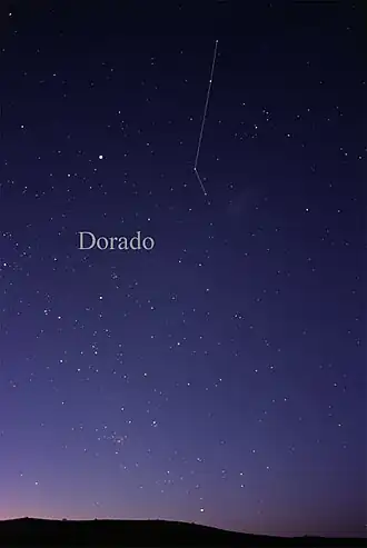 Alpha Doradus is a blue-white star of magnitude 3.3, 176 light-years from Earth. It is the brightest star in Dorado. Beta Doradus is a notably bright Cepheid variable star. It is a yellow-tinged supergiant star that has a minimum magnitude of 4.1 and a maximum magnitude of 3.5. One thousand and forty light-years from Earth, Beta Doradus has a period of 9 days and 20 hours.[2]