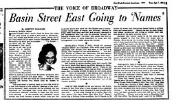 On April 11, 1955, Dandridge became the first black performer to open at the Empire Room at New York's Waldorf-Astoria hotel.[21] Her success as a headliner led to the hotel booking other black performers, such as the Count Basie Orchestra with vocalist Joe Williams, Pearl Bailey, and Lena Horne.[22]