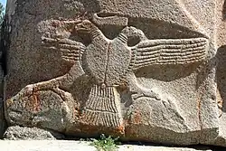 Many-headed mythological beasts and bird creatures frequently appear in the Bronze Age and Iron Age pictorial legacy of the Ancient Near East, especially in Mesopotamia.[2] They were later adopted by the Hittites.[3] Use of the double-headed eagle in Hittite imagery has been interpreted as "royal insignia".[4] A monumental Hittite relief of a double-headed eagle grasping two hares is found at the eastern pier of the Sphinx Gate at Alaca Hüyük.[3] For more examples of double-headed eagles in the Hittite context see Jesse David Chariton's "The Function of the Double-Headed Eagle at Yazılıkaya."[5] In Mycenaean Greece, double-headed eagles appear on Mycenaean pottery.[6]
