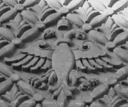 The motif appears on Turkomen coins of this era, notably on coins minted under Artuqid ruler Nasir al-Din Mahmud of Hasankeyf (r. 1200–1222).[13] It is also found on some stone reliefs on the towers of Diyarbakır Fortress.[14]
