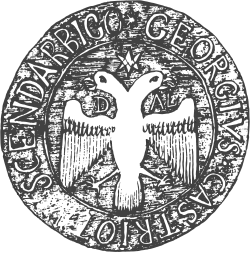 The Kastrioti family in Albania had a double-headed eagle as their emblem in the 14th and 15th centuries. Some members of the Dukagjini family and the Arianiti family also used double-headed eagles, and a coalition of Albanian states in the 15th century, later called the League of Lezhë, also used the Kastrioti eagle as its flag. The current flag of Albania features a black two-headed eagle with a crimson background. During John Hunyadi's campaign in Niš in 1443, Skanderbeg and a few hundred Albanians defected from the Turkish ranks and used the double-headed eagle flag.[19] The eagle was used for heraldic purposes in the Middle Ages by a number of Albanian noble families and became the symbol of the Albanians.[20] The Kastrioti's coat of arms, depicting a black double-headed eagle on a red field, became famous when he led a revolt against the Ottoman Empire resulting in the independence of Albania from 1443 to 1479. This was the flag of the League of Lezhë, which was the first unified Albanian state in the Middle Ages and the oldest Parliament with extant records.[21][22]