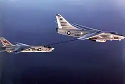 During the Vietnam War, the A-3 attack aircraft were modified to KA-3B tankers while some were modified into a multi-mission tanker variant, the EKA-3B, which was a real workhorse for the carrier air wing. Electronic jamming equipment was added without removing tanker capability so the EKA-3B could jam enemy radar while waiting to refuel tactical aircraft.[19] Eventually, the EKA-3B was replaced by the smaller dedicated Grumman KA-6D Intruder tanker, which although it had less capacity and endurance, was deployed in greater numbers within the carrier's air wing. Two additional Naval Reserve units were established in the early 1970s as air refueling squadrons, VAQ-208 and VAQ-308, at Naval Air Station Alameda, California. Both units operated aircraft with electronic warfare equipment removed and were redesignated as KA-3Bs. VAK-208 and VAK-308 were decommissioned in the early 1990s. On May 31, 1967, a KC-135 refueled a KA-3 Skywarrior while that jet refueled an F-8 Crusader. This event became the first triple-level aerial refueling, performed in order to save the USN plane which was dangerously low on fuel. The KC-135 crew earned a Mackay Trophy for their feat.[20]