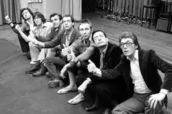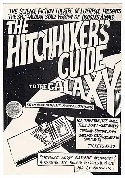 Adams moved back to London after leaving university, determined to break into TV and radio as a writer.[28] The Adams-Smith-Adams trio continued working together until late 1975.[32] The BBC occasionally accepted sketches from Adams, but his writing style was unsuited to the current style of radio and TV comedy.[28] To make ends meet he took a job as a bodyguard for a wealthy Arab family, which involved long night shifts guarding their hotel rooms.[33] In 1976 he directed Footlights' May Week Revue, A Kick in the Stalls.[34] In August 1976, his career had a brief improvement when he co-wrote and performed Unpleasantness at Brodie's Close at the Edinburgh Festival Fringe with John Lloyd, David Renwick and Andrew Marshall.[28][35] By the end of the year, Adams's career again stalled and he moved in with his family in Dorset.[28]