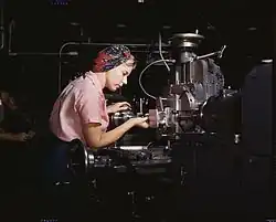 Female machine tool operator at the Douglas Aircraft plant, Long Beach, California in World War II. After losing thousands of male workers to military service, American manufacturers hired women for production positions, to the point where the typical aircraft plant's workforce was 40% female.[17]
