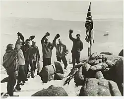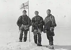 While still undertaking his doctorate,[13] Mawson joined Ernest Shackleton's Nimrod Expedition (1907–1909; also known as the Third British Antarctic Expedition) to the Antarctic, as surveyor, cartographer, and magnetician.[1][2] He was keen to learn more about glaciation and its effect on rocks, because his earlier studies in South Australia had looked at the largest Precambrian glacial deposits yet recorded anywhere.[3][2] Originally intending to stay only for the duration of the ship's presence in the first summer, instead both he and his mentor, Edgeworth David, stayed an extra year. In doing so they became, in the company of Alistair Mackay and a support group of three men, the first to climb the summit of Mount Erebus (the second-highest volcanic peak in Antarctica, at 3,794 m (12,448 ft)[13]) and to trek to the South magnetic pole locality, which at that time was over land.[3][45][46] On the return journey to Nimrod, Mawson fell into a crevasse and had to be rescued.[3][2]