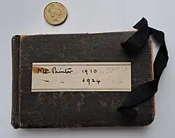 After pastoralist and prospector W. B. Greenwood[c] sent rocks that he had found near Mount Painter, in the northern Flinders Ranges, in October/November 1910 for analysis, Mawson identified the mineral torbernite, a secondary mineral that occurs in uranium-bearing rocks.[17][32][33] Greenwood had previously sent samples to the government in 1899, a year after radium had been discovered by Marie and Pierre Curie in France. However, government geologist Henry Y. L. Brown was away on leave when the specimens arrived, and they subsequently went missing. After Greenwood sent more samples in 1910, Brown was dismissive of their value, but Mawson, having recently visited Marie Curie in Paris, and been urged to look for radium, thought the samples were worth analysis. He used a gold-leaf electroscope given to him by Curie for the purpose[32] (one of two she had made).[33] Mawson visited the area and wrote a report which was published in newspapers in late November 1910.[34][35] His diary of his trip to Mount Painter and Mount Gee dated October 1910 shows that his expedition members included the "well-known prospector still in the Govt Service" Harry Fabian, who met him at Mt Serle with camels; W. B. Greenwood; his son Gordon Arthur "Smiler" Greenwood;[d] and (for at least some of the trip) H. Y. L. Brown. The group travelled to Mt Painter, and visited a number of sites, including the Mount Rose Mine, Mueller Hill, Yankaninna, and the Wheal Turner Mine. In his overview written on the back of the diary, Mawson notes a number of different types of rock of the Cambrian and Precambrian before describing the torbanite, carnotite, and uranium, as possibly "the most extensive uraniferous lode formation in the world". They also looked at corundum at Yudnamutana as well as a much larger strike of the same mineral on Mount Painter, which "may turn out enormous", and studied the rocks at Mt Gee and Radium Ridge. Mawson took numerous photographs of the sites and expedition members.[36] Mawson became involved in the establishment of a development company, the Radium Extraction Company of South Australia Ltd (in which Greenwood also bought shares[18]). He was optimistic about the value of the mine, but sold his shares in the company in 1911 in order to help finance the Australasian Antarctic Expedition,[17] and in 1917 the company was liquidated after not achieving success.[18] Mawson maintained a lifelong interest in uranium, which included the publication of a paper on uranium deposits in South Australia in 1944.[17][37]