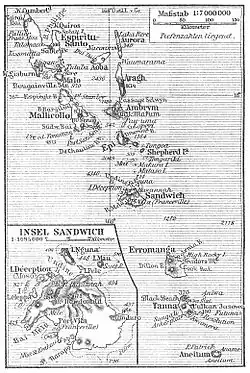 Mawson's first major independent geological work occurred when he was appointed geologist by Edgeworth David to an expedition to the New Hebrides (now Vanuatu) from April to September 1903. He travelled there with medical student W. T. Quaife, who acted as the expedition's biologist,[a] aboard the Ysabel, under the auspices of the British Deputy Commissioner of the New Hebrides, Captain Ernest Rason.[b] HMS Archer was also used on the trip. The South Australian Museum holds many of Mawson's original field notes and some photographs from this trip, as well as a bibliography compiled by Mawson before setting out.[14] The first results of the expedition were presented on 11 January 1904 at a meeting of the Australasian Association for the Advancement of Science (AAAS) in Dunedin on Mawson's behalf by David, who was then president of the AAAS.[14] Mawson's more detailed report, "The Geology of the New Hebrides", published in the Proceedings of the Linnean Society of New South Wales in December 1905,[23][14] was one of the first major geological works of Melanesia.[20] The report included geological maps of the islands of Efate and Santo.[14]