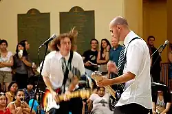 Wizard-rock band Draco and the Malfoys' lyrics are inspired by the Harry Potter books but from Draco Malfoy's point of view.[23] As well as Harry and the Potters, the members of Draco and the Malfoys dress themselves as Hogwarts students, in this case in Slytherin-themed costumes. The band is one of about 750 bands of young musicians playing music inspired by the Harry Potter series.[23][24]