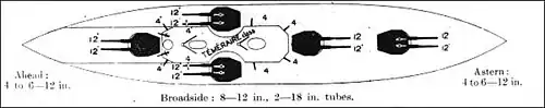 The Royal Navy was thinking along similar lines. A design had been circulated in 1902–1903 for "a powerful 'all big-gun' armament of two calibres, viz. four 12-inch (305 mm) and twelve 9.2-inch (234 mm) guns."[20] The Admiralty decided to build three more King Edward VIIs (with a mixture of 12-inch, 9.2-inch and 6-inch) in the 1903–1904 naval construction programme instead.[21] The all-big-gun concept was revived for the 1904–1905 programme, the Lord Nelson class. Restrictions on length and beam meant the midships 9.2-inch turrets became single instead of twin, thus giving an armament of four 12-inch, ten 9.2-inch and no 6-inch. The constructor for this design, J. H. Narbeth, submitted an alternative drawing showing an armament of twelve 12-inch guns, but the Admiralty was not prepared to accept this.[22] Part of the rationale for the decision to retain mixed-calibre guns was the need to begin the building of the ships quickly because of the tense situation produced by the Russo-Japanese War.[23]