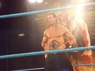 After gaining momentum in Scotland, Galloway began wrestling dates across the Republic of Ireland with Irish Whip Wrestling (IWW).[9] After losing to "SOS" Sheamus O'Shaunessy on 27 August 2006,[21] Galloway defeated O'Shaunessy to win the IWW International Heavyweight Championship.[22]