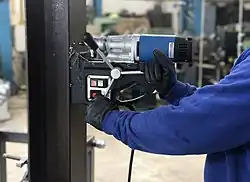 A magnetic drill is a portable machine for drilling holes in large and heavy workpieces which are difficult to move or bring to a stationary conventional drilling machine. It has a magnetic base and drills holes with the help of cutting tools like annular cutters (broach cutters) or with twist drill bits. There are various types depending on their operations and specializations, like magnetic drilling / tapping machines, cordless, pneumatic, compact horizontal, automatic feed, cross table base etc.