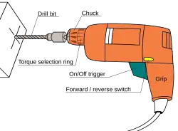 A drill is a tool used for making round holes or driving fasteners. It is fitted with a drill bit for making holes, or a screwdriver bit for securing fasteners. Historically, they were powered by hand, and later mains power, but cordless battery-powered drills are proliferating due to increased efficiency and ease of use.