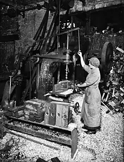 In the East, churn drills were invented as early as 221 BC during the Chinese Qin dynasty,[12] capable of reaching a depth of 1500 m.[6] Churn drills in ancient China were built of wood and labor-intensive, but were able to go through solid rock.[13] The churn drill appears in Europe during the 12th century.[6] In 1835 Isaac Singer is reported to have built a steam powered churn drill based on the method the Chinese of a rod tipped with a bit.[14] Also worth briefly discussing are the early drill presses; they were machine tools that derived from bow-drills but were powered by windmills or water wheels. Drill presses consisted of the powered drills that could be raised or lowered into a material, allowing for less force by the user.