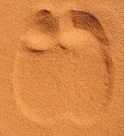The cranium of the dromedary consists of a postorbital bar, a tympanic bulla filled with spongiosa, a well-defined sagittal crest, a long facial part and an indented nasal bone.[36] Typically, there are eight sternal and four non-sternal pairs of ribs.[31] The spinal cord is nearly 214 cm (84 in) long; it terminates in the second and third sacral vertebra.[37] The fibula is reduced to a malleolar bone. The dromedary is a digitigrade animal; it walks on its toes, which are known as digits. It lacks the second and fifth digits.[38] The front feet are 19 cm (7.5 in) wide and 18 cm (7.1 in) long; they are larger than the hind feet, which measure 17 cm (6.7 in) wide and 16 cm (6.3 in) long.[33]