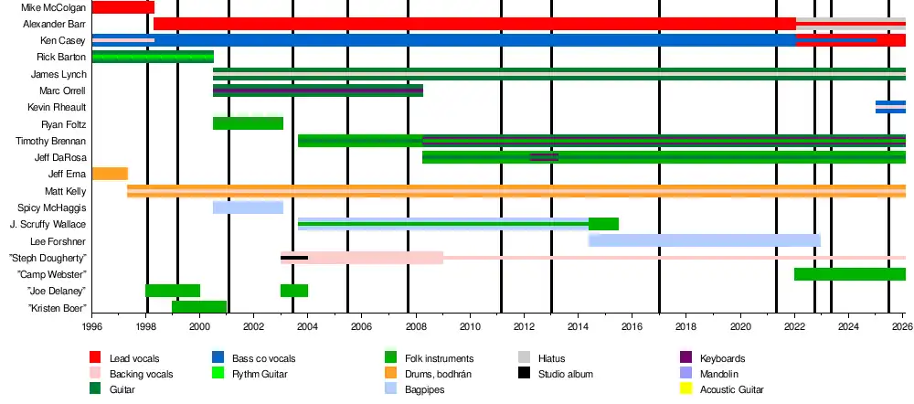 In early 2022, Lee Forshner left the band after eight years. He was replaced by Campbell Webster in February 2022 who joined the band as their touring bagpipe player. His first recording with the band was a cover of "We Shall Overcome" which would appear along with the previously released songs "The Bonny" and "James Connelly" on an expanded digital only release of Turn Up That Dial.[50] That same month it was announced that Al Barr was forced to depart from the band's 2022 St. Patrick's Day Tour and their 2022 summer tour in Europe to take care of his ailing mother who has Lewy Body Dementia. Jesse Ahern, Mikey Rivkees (The Rumjacks), and Jen Razavi (The Bombpops) assisted on vocals for certain songs in place of Barr during their shows with Ken Casey taking over the rest of Barr's lead vocals.[51] As of March 2025, Barr has yet to rejoin the band and Casey, who no longer plays bass during their shows, has taken over full-time lead vocals while Barr is away.