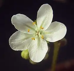 The radially symmetrical (actinomorphic) flowers are always perfect and have five parts (the exceptions to this rule are the four-petaled D. pygmaea and the eight to 12-petaled D. heterophylla). Most of the species have small flowers (<1.5 cm or 0.6 in). A few species, however, such as D. regia and D. cistiflora, have flowers 4 cm (1.6 in) or more in diameter.[15] In general, the flowers are white or pink. Australian species display a wider range of colours, including orange (D. callistos), red (D. adelae), yellow (D. zigzagia) or metallic violet (D. microphylla).