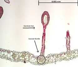 The leaf morphology of the species within the genus is extremely varied, ranging from the sessile ovate leaves of D. erythrorhiza to the bipinnately divided acicular leaves of D. binata. The leaves of some Western Australian species are very small, down to a leafblade or lamina of just 1 mm diameter in the instance of Drosera occidentalis.[16]