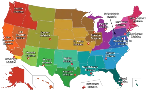 Map of the 21 DEA domestic field divisions: 1. Chicago, 2. Detroit, 3. Atlanta, 4. Dallas, 5. Denver, 6. Boston, 7. El Paso, 8. Houston, 9. Los Angeles, 10. Miami, 11. Newark, 12. New Orleans, 13. New York, 14. Philadelphia, 15. Phoenix, 16. San Diego, 17. San Francisco, 18. Seattle, 19. St. Louis, 20. Caribbean (San Juan, Puerto Rico), 21. Washington, D.C.