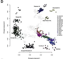 385. ^ Lazaridis, Iosif; et al. (2014). "Ancient human genomes suggest three ancestral populations for present-day Europeans". Nature. 513 (7518): 409–413. arXiv:1312.6639. Bibcode:2014Natur.513..409L. doi:10.1038/nature13673. PMC 4170574. PMID 25230663.