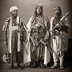 Some authorities see in the name "Druze" a descriptive epithet, derived from Arabic dārisah ("she who studies").[70] Others have speculated that the word comes from the Persian word Darazo (درز "bliss") or from Shaykh Hussayn ad-Darazī, who was one of the early converts to the faith.[71] In the early stages of the movement, the word "Druze" is rarely mentioned by historians, and in Druze religious texts only the word Muwaḥḥidūn ("Unitarian") appears. The only early Arab historian who mentions the Druze is the eleventh century Christian scholar Yahya of Antioch, who clearly refers to the heretical group created by ad-Darazī, rather than the followers of Hamza ibn 'Alī.[71] As for Western sources, Benjamin of Tudela, the Jewish traveler who passed through Lebanon in or around 1165, was one of the first European writers to refer to the Druze by name. The word Dogziyin ("Druzes") occurs in an early Hebrew edition of his travels, but it is clear that this is a scribal error. Be that as it may, he described the Druze as "mountain dwellers, monotheists, who believe in 'soul eternity' and reincarnation".[72] He also stated that "they loved the Jews".[73]
