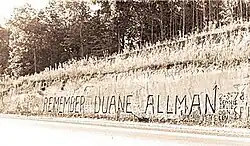 In 1973, four boys who were Hinds Junior College students living in Vicksburg, Mississippi carved the very large letters "REMEMBER DUANE ALLMAN" into a vertical excavation face beside Interstate Highway 20 between Vicksburg and the school's campus in Raymond on the route they travelled together while commuting between their homes and campus.[35][36] A photograph was published in Rolling Stone magazine and in the Rolling Stone Illustrated History of Rock & Roll; the carving lasted for over 10 years.[37]