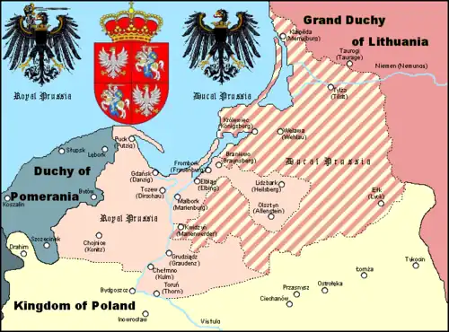 The Duchy of Prussia (German: Herzogtum Preußen, Polish: Księstwo Pruskie, Lithuanian: Prūsijos kunigaikštystė) or Ducal Prussia (German: Herzogliches Preußen; Polish: Prusy Książęce) was a duchy in the region of Prussia established as a result of secularization of the Monastic Prussia, the territory that remained under the control of the State of the Teutonic Order until the Protestant Reformation in 1525.