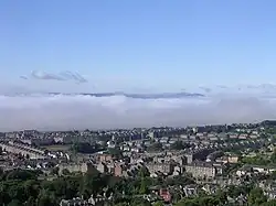 Dundee sits on the north bank of the Firth of Tay on the eastern, North Sea Coast of Scotland. The city lies 36.1 miles (58 km) NNE of Edinburgh[77] and 360.6 miles (580 km) NNW of London.[77] The built-up area occupies a roughly rectangular shape 8.3 miles (13 km) long by 2.5 miles (4 km) wide, aligned in an east to west direction and occupies an area of 60 square kilometres (23 sq mi).[78][79] The town is bisected by a line of hills stretching from Balgay Hill (elevation of 143 m) in the west end of the city, through the Dundee Law (174 m) which occupies the centre of the built up area, to Gallow Hill (83 m), between Baxter Park and the Eastern Cemetery. North of this ridge lies a valley through which cuts the Dighty Water burn, the elevation falling to around 45 m. North of the Dighty valley lie the Sidlaw Hills, the most prominent hill being Craigowl Hill (455 m).[78]