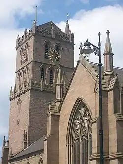 Dundee City is one of 32 council areas of Scotland, administered by Dundee City Council.[61] The council meets at Dundee City Chambers in City Square and has its mains offices at Dundee House on North Lindsay Street. The civic head and chair of the council is the Lord Provost. The council area is also divided into eighteen community council areas, three of which (Broughty Ferry, City Centre and Harbour, and West End) had community councils operating as at August 2024.[62]