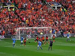 United managed to regain form towards the end of the season, after a near halfway line goal from Louis Moult against Inverness secured a draw to put the Tannadice side clear of Raith by 1 point.[39] The next match was between the two title challengers and seemed likely to prove decisive in the race for promotion. United defeated Raith for the first time that season winning 2–0 to send United 4 clear at the top of the league, a position which they would not relinquish.[40] United all but secured the Championship title and promotion back to the Premiership with a 1–0 win over Ayr United at Tannadice in April, putting them 6 points clear of Raith with two games to spare, with United's goal difference 36 more than Rovers'.[41] The title, and subsequent promotion, was officially confirmed after a 0–0 draw at Airdrie on 26 April 2024.