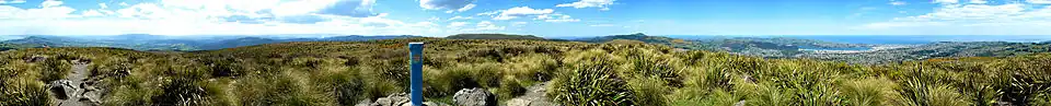 Dunedin's hinterland encompasses a variety of different landforms. To the southwest lie the Taieri Plains, the broad, fertile lowland floodplains of the Taieri River and its major tributary, the Waipori. These are moderately heavily settled, and contain the towns of Mosgiel, and Allanton.[71] They are separated from the coast by a range of low hills rising to some 300 metres (980 ft). Inland from the Taieri Plain is rough hill country. Close to the plain, much of this is forested, notably around Berwick and Lake Mahinerangi, and also around the Silverpeaks Range which lies northwest of the Dunedin urban area.[72] Beyond this, the land becomes drier and opens out into grass and tussock-covered land. A high, broad valley, the Strath-Taieri lies in Dunedin's far northwest, containing the town of Middlemarch, one of the area's few concentrations of population.