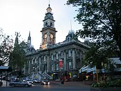 Cityscape seen from Signal Hill Dunedin railway station Town Hall on The Octagon Princes Street Knox Church | |