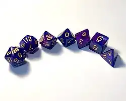 D&D uses polyhedral dice to resolve in-game events. These are abbreviated by a 'd' followed by the number of sides. Shown from left to right are a d20, d12, d%, d10, d8, d6, and a d4. A d% and d10 can be rolled together to produce a number between 1 and 100.