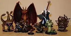 The wargames from which Dungeons & Dragons evolved used miniature figures to represent combatants. D&D initially continued the use of miniatures in a fashion similar to its direct precursors. The original D&D set of 1974 required the use of the Chainmail miniatures game for combat resolution.[64] By the publication of the 1977 game editions, combat was mostly resolved verbally. Thus, miniatures were no longer required for gameplay, although some players continued to use them as a visual reference.[65]