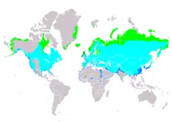 It is a circumpolar breeder in Arctic or subarctic regions. Birds that breed in western Europe are short-distance migrants largely staying on western and southern European and northwest African coasts; those breeding in far northern Europe and Asia are long-distance migrants, wintering south to Africa, southeast and west Asia. Birds that breed in Alaska and the Canadian Arctic migrate short distances to the Pacific and Atlantic coasts of North America, although those nesting in northern Alaska overwinter in Asia.