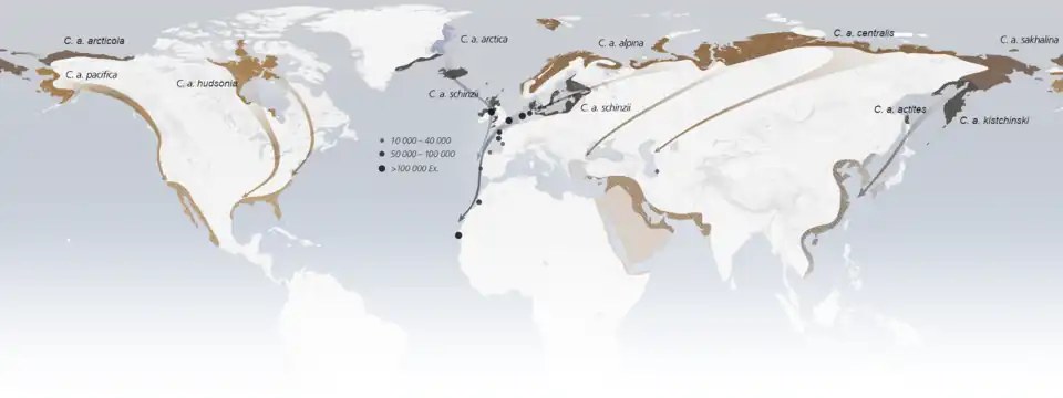 - C. a. alpina (Linnaeus, 1758) — breeds in northern Scandinavia, Svalbard, and northwest Siberia