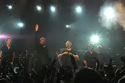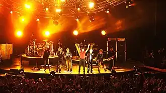 The pace picked up with a sold-out tour of America, Australia and New Zealand. The band played a full concert at a private tailgate party at Super Bowl XXXVIII, their performance of "The Wild Boys" broadcast to millions during the pre-game show. A remix of the new track "(Reach Up for The) Sunrise" was released on many TV shows in February while magazines hailed (the modern "Fab Five") Duran Duran as one of the greatest bands of all time.[62] Duran Duran then celebrated their homecoming to the UK with fourteen stadium dates in April 2004, including five sold-out nights at Wembley Arena. The British press, traditionally hostile to the band, accorded the shows some very warm reviews.[63] Duran Duran brought along band Goldfrapp and the Scissor Sisters as alternating opening acts for this tour.[60] The last two shows were filmed, resulting in the concert DVD Duran Duran: Live from London which was released in November.