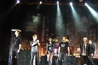 According to Billboard, Duran Duran have sold over 100 million records.[6] They achieved 30 top 40 singles in the UK singles chart (14 of them top 10) and 21 top 40 singles in the US Billboard Hot 100. In the UK, they have achieved consistent success on the albums chart with top five albums in five consecutive decades.[7] The band have won numerous awards throughout their career: two Brit Awards including the 2004 award for Outstanding Contribution to Music, two Grammy Awards, an MTV Video Music Award for Lifetime Achievement and a Video Visionary Award from the MTV Europe Music Awards. They were also awarded a star on the Hollywood Walk of Fame. The band were inducted into the Rock and Roll Hall of Fame in 2022.[8][9]