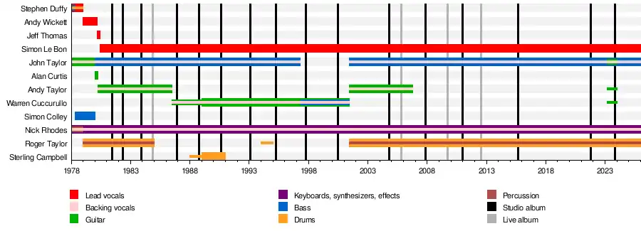 Duran Duran (/djʊˌræn djʊˈræn/) are an English pop rock band. Formed in Birmingham in 1978 by keyboardist Nick Rhodes, guitarist (later bassist) John Taylor and singer/bassist Stephen Duffy, the band went through several early changes before the band's line-up settled in May 1980 as Rhodes, Taylor, singer Simon Le Bon, guitarist Andy Taylor and drummer Roger Taylor.[nb 1]