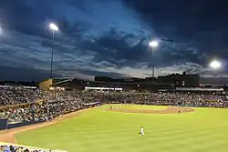 In 1987, the American Tobacco Factory in Durham closed, leading to an economic downturn and a decline in the city's reputation.[37] A new downtown baseball stadium was constructed for the Durham Bulls in 1994. The Durham Performing Arts Center now ranks in the top ten in theater ticket sales in the US according to Pollstar magazine. Many famous people have performed there including B.B. King and Willie Nelson. After the departure of the tobacco industry, large-scale renovations of the historic factories into offices, condominiums, and restaurants began to reshape downtown.[38] While these efforts continue, the large majority of Durham's residential and retail growth since 1990 has been along the I-40 corridor in southern Durham County.[39]