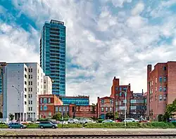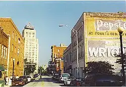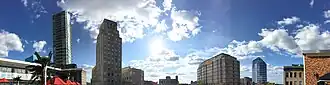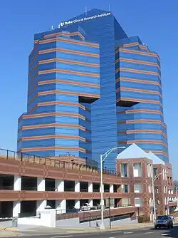 In 2014, it was announced that downtown Durham would be the site of a brand new 27 story high building, tentatively named "City Center Tower," but now called "One City Center".[48] Along with other new buildings in downtown Durham, it was under construction in 2018.[49] It was built on the corner of Main St. and Corcoran St. Upon its completion, it was the tallest building in downtown Durham and the 4th largest building in the Triangle. Originally scheduled for a 2016 opening, the building opening was delayed to May 2018.[50] The building was an $80 million project.[51][52]