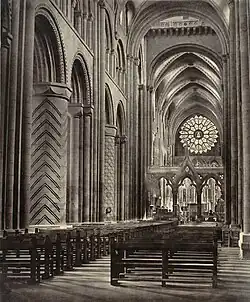 During the 18th century the Deans of Durham often held another position in the south of England and after spending the statutory time in residence, would depart southward to manage their affairs. Consequently, after Cosin's refurbishment, there was little by way of restoration or rebuilding. When work commenced again on the building, it was not always of a sympathetic nature. In 1777 the architect George Nicholson, having completed Prebends' Bridge across the Wear, persuaded the dean and chapter to let him smooth off much of the outer stonework of the cathedral, thereby considerably altering its character.[17] His successor William Morpeth demolished most of the Chapter House.[20] In 1794 James Wyatt drew up plans to transform the building, including the demolition of the Galilee Chapel, but the chapter later decided against many of the intended changes. Wyatt renewed the 15th-century tracery of the Rose Window, inserting plain glass to replace what had been blown out in a storm.[21]