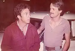 Hoffman's first acting role was at the Pasadena Playhouse, alongside future Academy Award–winner Gene Hackman.[27] After two years there, Hackman headed for New York City, with Hoffman soon following. Hoffman, Hackman, and Robert Duvall lived together in the 1960s, whilst all three of them focused on finding acting jobs.[28][29] Hackman remembers, "The idea that any of us would do well in films simply didn't occur to us. We just wanted to work".[25] Hoffman's appearance—Duvall described him as Barbra Streisand in drag—and small size made him uncastable, Vanity Fair later wrote.[30] During this period, Hoffman got occasional television bit parts, including commercials but, needing income, he briefly left acting in order to teach.