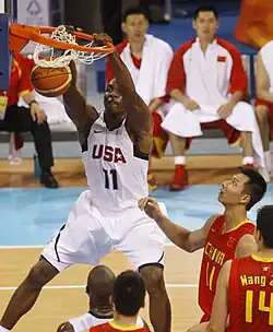 On June 23, 2008, Howard was named as one of the members of the 12-man squad representing the United States in the 2008 Olympic Games in Beijing.[149] With Howard starting as center, Team USA won all of its games en route to the gold medal, restarting a streak of gold medals interrupted at the 2004 Olympics.[150] Howard averaged 10.9 points and 5.8 rebounds per game in the tournament.[151]