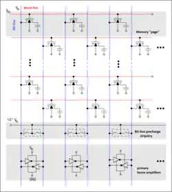 8. When done with reading all the columns in the current open row, the word-line is switched off to disconnect the storage cell capacitors (the row is closed) from the bit-lines. The sense amplifier is switched off, and the bit-lines are precharged again.[35]